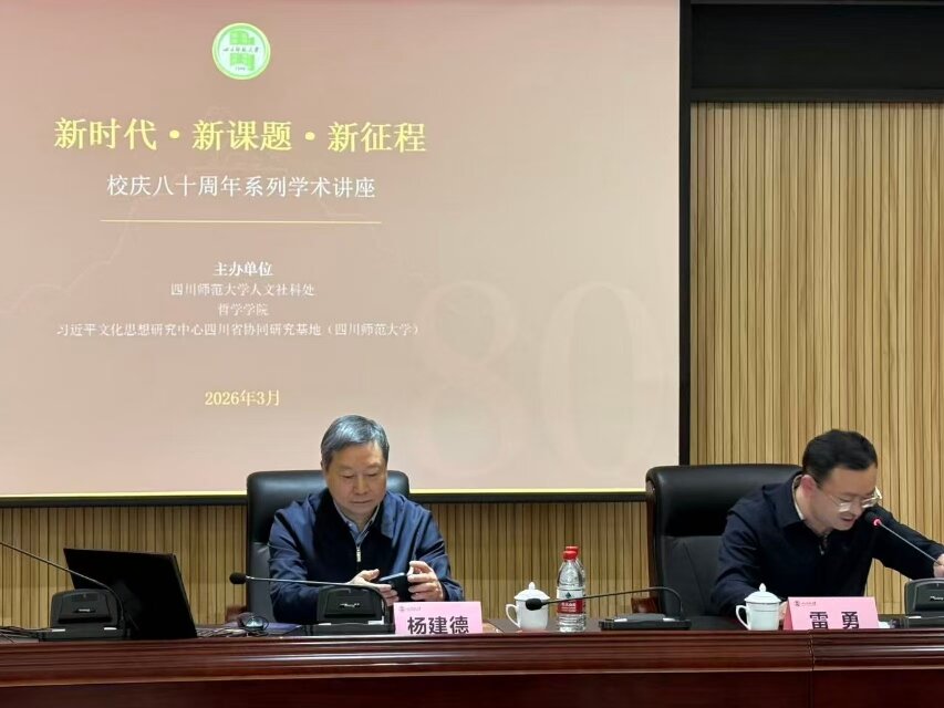3月26日下午,“新时代·新课题·新征程”——校庆八十周年系列学术讲座之2026年全国两会精神解读专题讲座在明德楼三楼干训教室举行。本次讲座由习近平文化思想研究中心四川省协同研究基地、人文社科处、哲学学院共同承办,特邀全国政协委员、成都市政协副主席杨建德教授主讲,哲学学院雷勇教授主持,全校相关学科教师、哲学学院教职工及研究生、本科生等80余人参加。